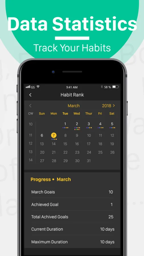Card statistics: You can see the target progress for each month, and you can know what to clock on that day by clicking on the dots at different colors below the date.