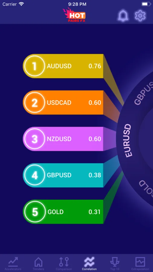 Correlation - The correlation screen shows the correlation of one currency pair with 5 other currency pairs in a descending order. So the top currency pair with number 1 is highly correlated and number 5 is least correlated to currency pair selected from the dial.