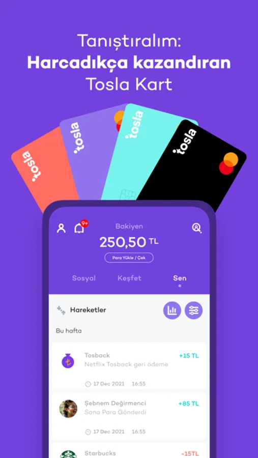 Dijital kartın anında Tosla hesabında! Dijital kartını anında internet alışverişlerinde, QR ve mobil temassız ödemelerinde hemen kullanmaya başla. Tosla kartınla yapacağın alışverişlerinden 450 TL’ye varan Tosback kazanmak için hemen Tosla uygulamasını indir, sen de tosla!