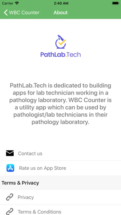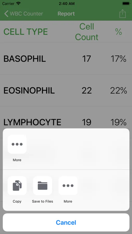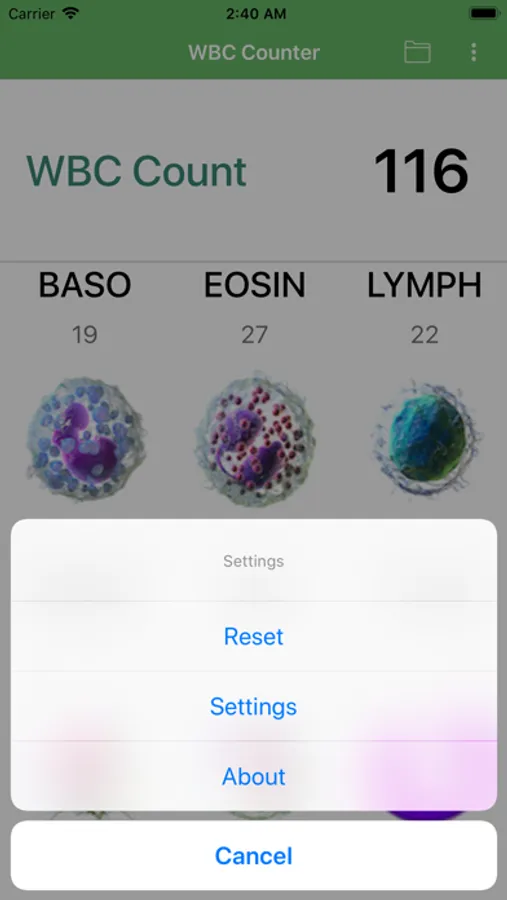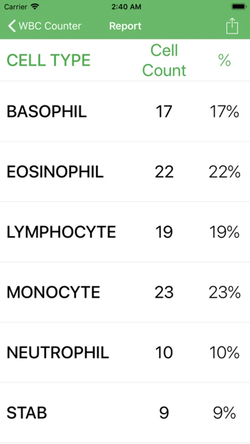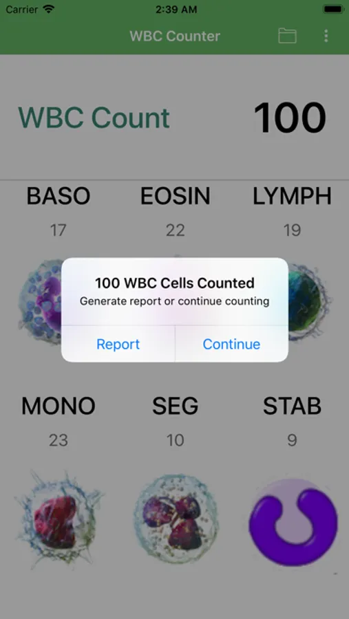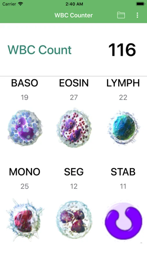 This app supports neutrophil, segmented, band, eosinophil, basophil, lymphocyte, monocyte counts.