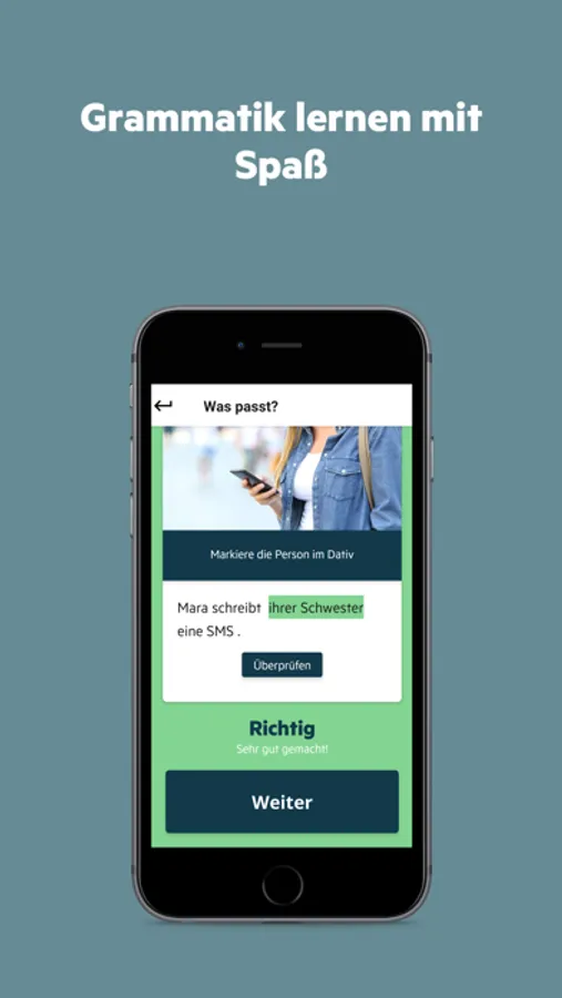 Wähle zuerst aus, ob du gerade Grammatik trainieren, Wörter lernen, dein Hörverständnis verbessern oder mit einem Lesetext arbeiten möchtest. Dann bekommst du Screen für Screen Informationen und Übungen, die du für diese Lektion brauchst. Bevor du einen Text liest, stellt die App dir zum Beispiel Vokabeln vor, die du wahrscheinlich noch nicht kennst – mit Erklärung und Beispielsatz. Oder sie erklärt grammatikalische Aspekte, die für das Thema wichtig sind. All das trainierst du immer sofort mit kleinen Fragen und Übungen. Lesetexte zeigen dir Vokabeln und Grammatik nicht nur im Kontext, sondern haben interessante Informationen über den Alltag in den deutschsprachigen Ländern zum Inhalt. So ist Deutsch-Lernen effizient und macht Spaß.