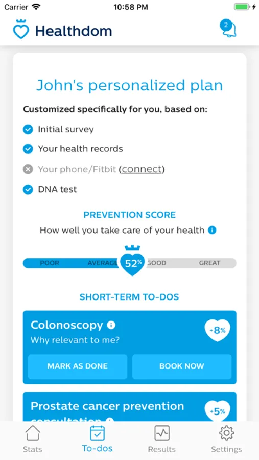 Prevent illness. Stay healthy in less than 5 mins a month! Take health assessment & DNA test, link your Apple’s Health app to personalize your prevention plan. You should consider consulting your doctor before making any medical decisions. Healthdom does not provide medical advice.