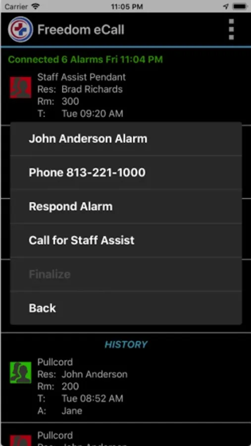 • Respond to alarms which notifies other mobile users and desktop application that you will be attending to call.