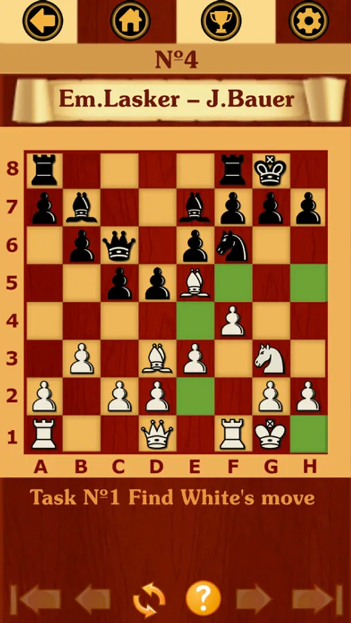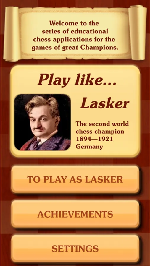 You have to study 50 commented games of the second World Chess Champion - Emanuel Lasker. In each game there will be tasks where it is necessary to find a move or the whole variation of the great Maestro, "to play like Lasker".