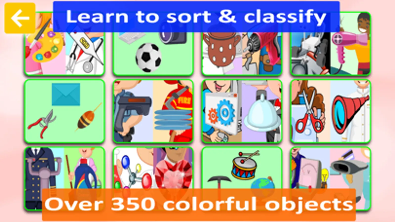 The application contains 12 mini-games with various colorful combinations of items. The child gets acquainted with different concepts and objects and learns to distinguish them.