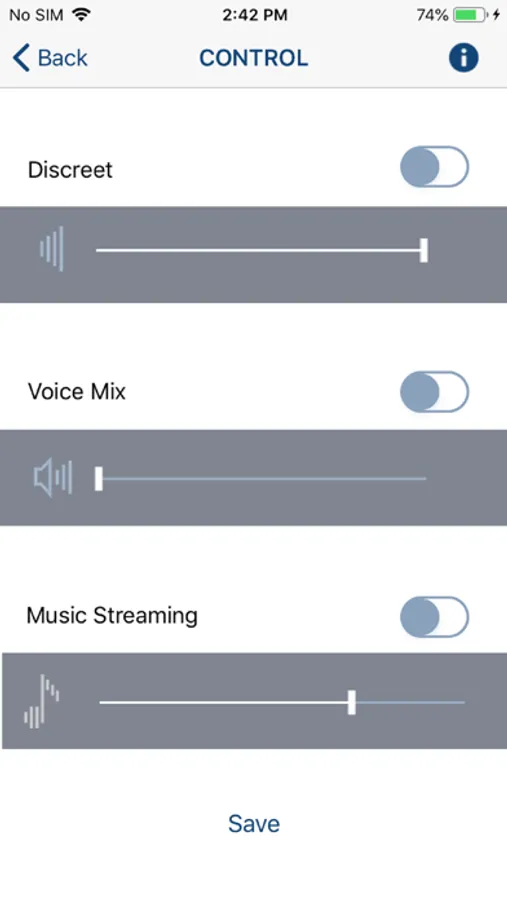 - Control volumes of Discreet, Voice Mix and Music streaming modes