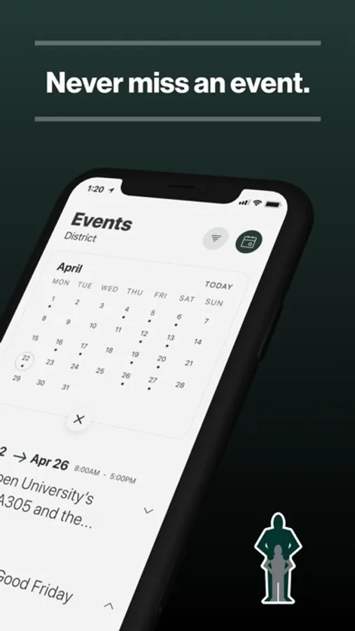 The event section shows a list of events throughout the district. Users can add an event to their calendar to share the event with friends and family with one tap.