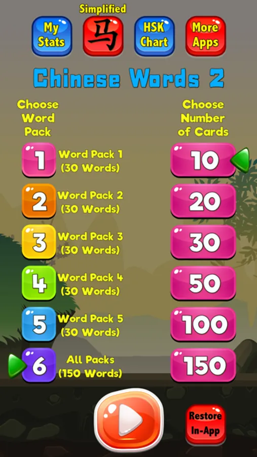 Words are based on level 2 of the HSK (Chinese Proficiency Test). This includes a total of 150 words. Both simplified (Mainland China) and traditional (Taiwan, Hong Kong) characters are supported. Audio is available for each word at the tap of a button.