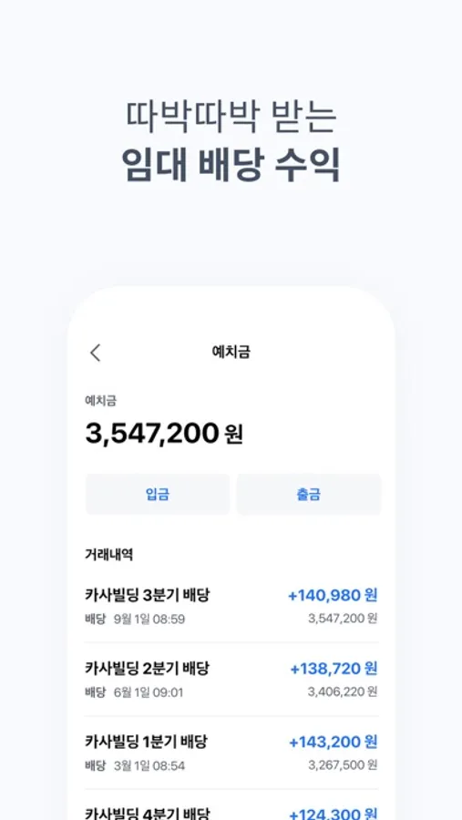 • 하고 싶은 일에 더 많이 집중하세요. 가만히 지분만 보유하고 있어도 3개월에 한 번씩 임대 수익에 대한 배당 지급됩니다. 배당금은 지분을 보유한 부동산, 건물 임대 수익이에요. (배당 횟수는 건물에 따라 다름.)