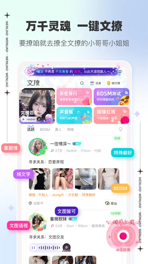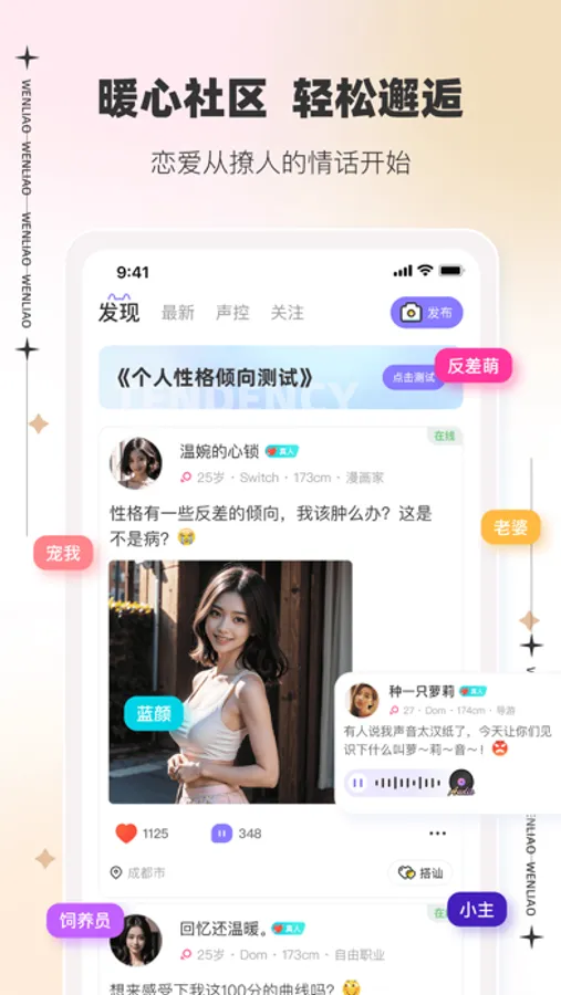 文撩是一个暖心的年轻人聊天交友社区,各种可爱的小哥哥小姐姐等你来文聊~