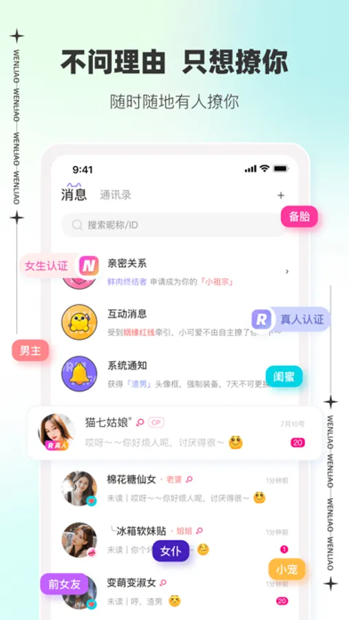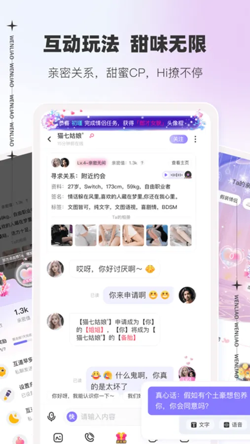 文撩支持建立各种有趣的亲密关系,男朋友/女朋友,备胎,闺蜜,秘书,女仆,爸爸等搞怪好玩的亲密关系,支持自定义关系名称,好玩不停~~