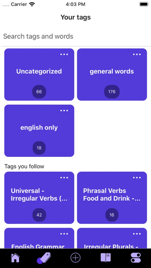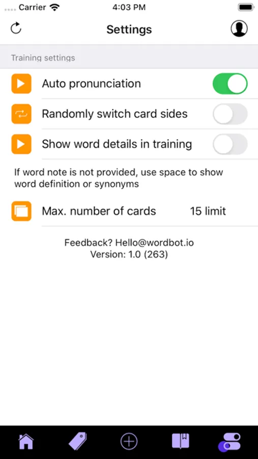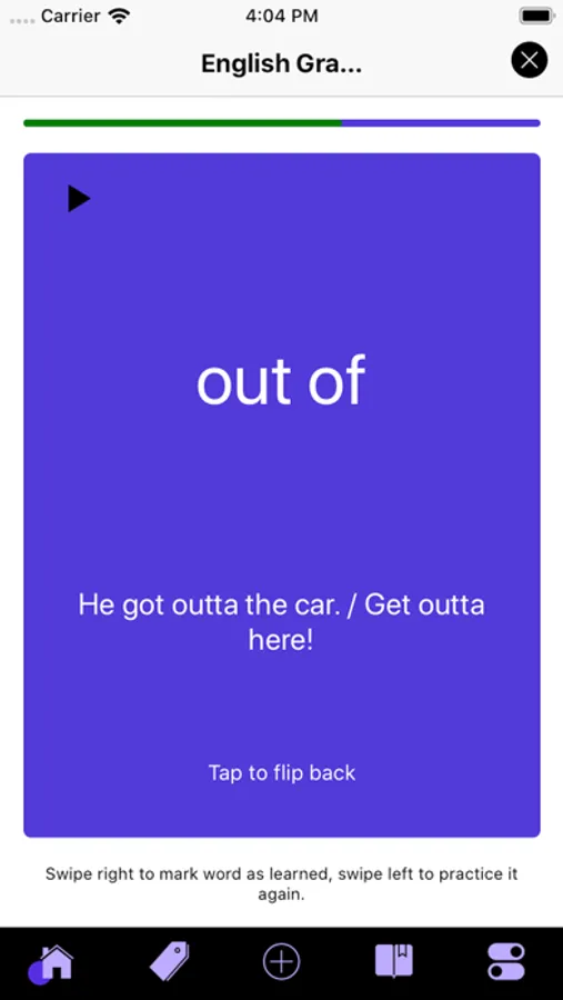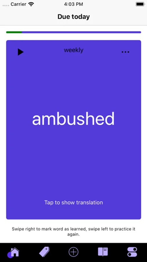 Turn your mobile phone into a deck of flashcards with the selection of your handpicked words you need to remember. Look at each word that appears on the top of the deck. Push the card up a bit with your finger and let it fall back to hear how this word sounds. Then, tap on the card to flip it over and reveal the meaning of this foreign word. How well do you already know it? Swipe the card to the right to mark the word as learned, or swipe the card to the left to practise it soon again.