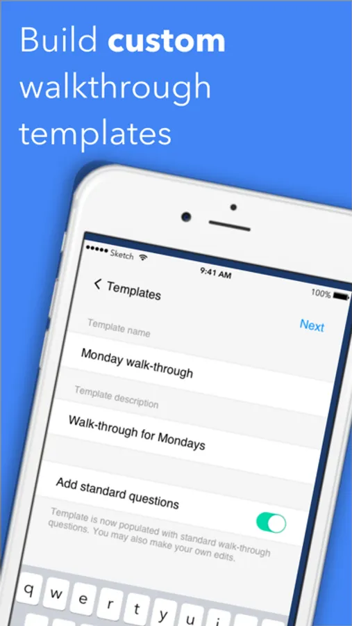 Use the standard template or build a custom template. With a custom template, you can create the entire walkthrough, from custom domain names to custom checkbox labels. You can also add comments to each question as well as photos and videos!!!
