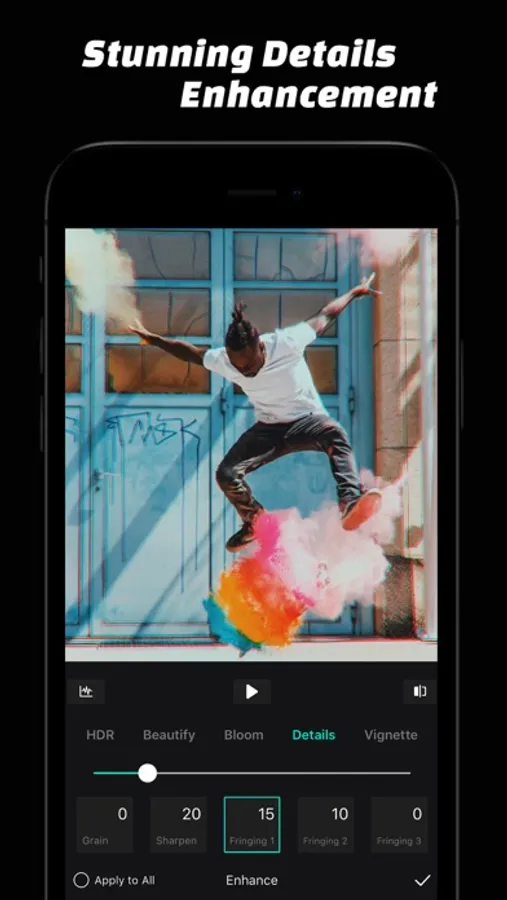 · Enhancement Tools: HDR, Beautify, Bloom, Ambient, Clarity, Grain, Sharpen, Fringing, Vignette.