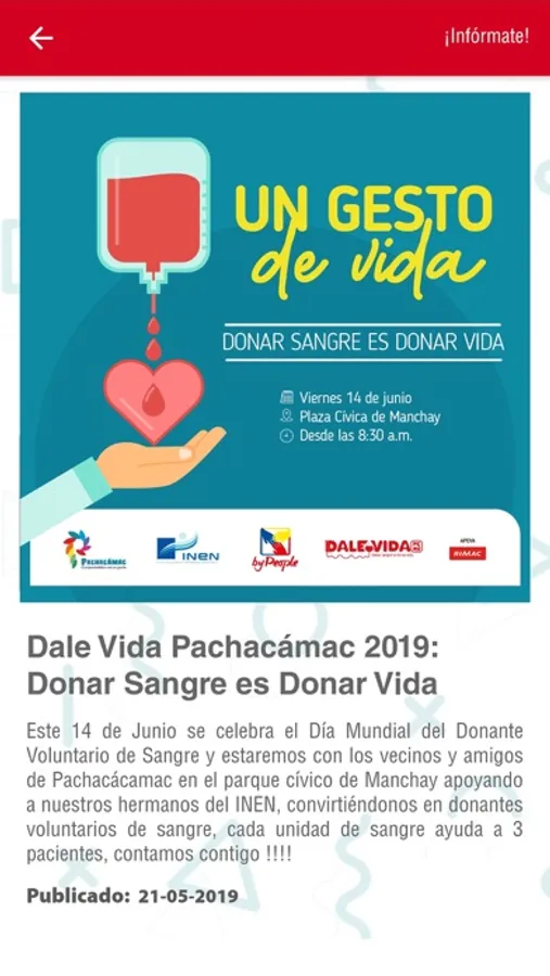 Es una aplicación desarrollada para asisitir al donante voluntario de sangre en su proceso de donación en favor de los pacientes del Inst. Nac. de Enfermedades Neoplasicas.