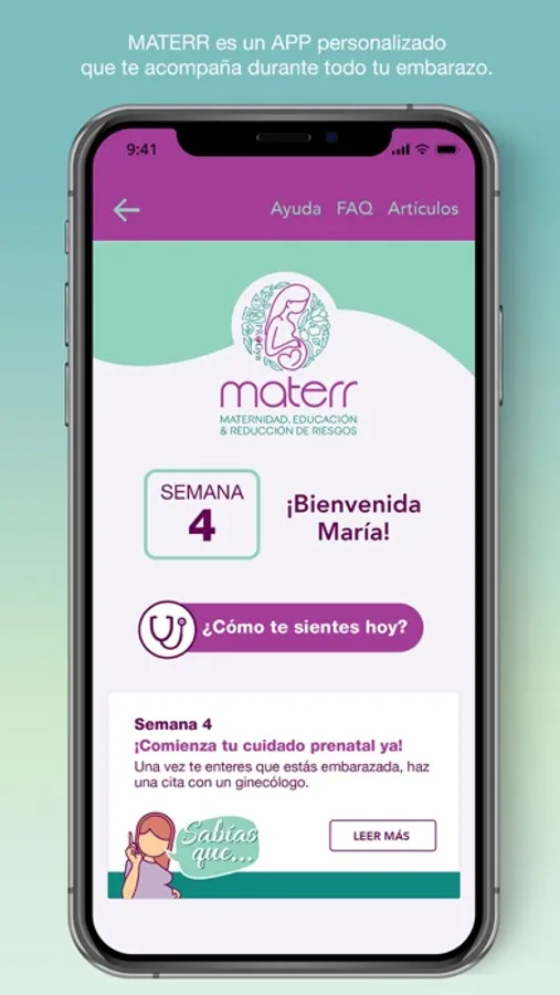 Es una aplicación diseñada por expertos en cuidado prenatal. MATERR te acompañará semana tras semana orientándote sobre cuidado prenatal, ejercicios, nutrición y suplementos, seguridad al viajar, salud mental y otros. Te orientará sobre las señales de alerta y síntomas que pudieran indicar posibles riesgos o complicaciones en el embarazo.