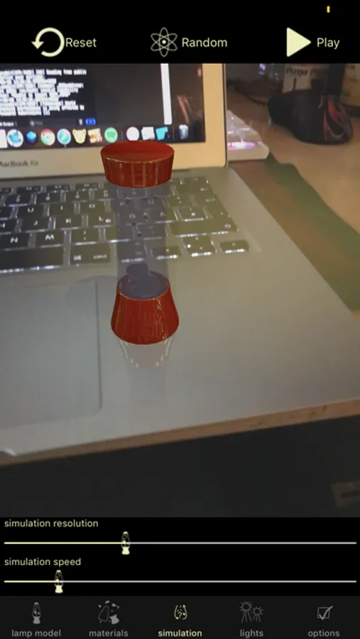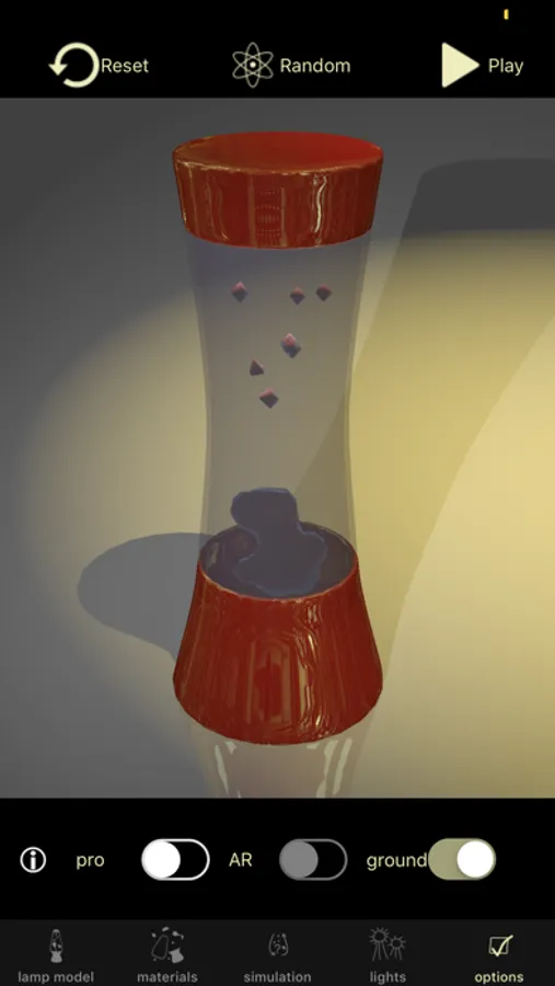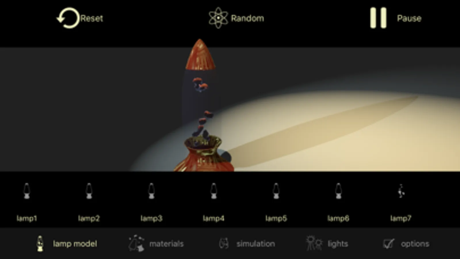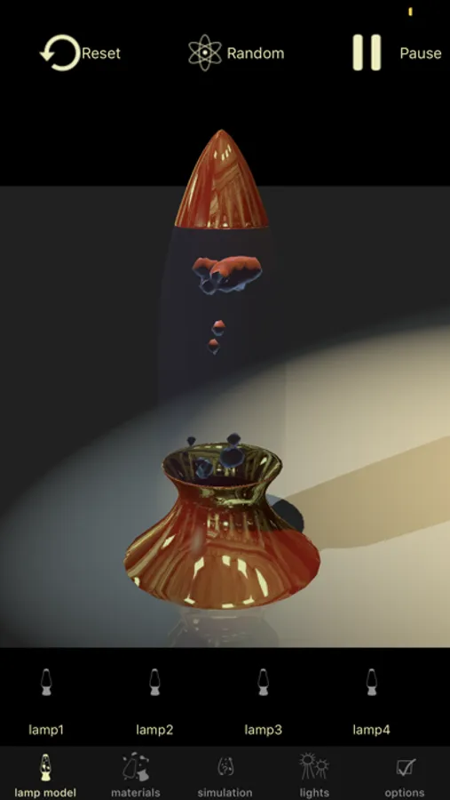 -tap at the display to rotate, move and zoom the scene -there is one special "empty" lamp-type which only shows the lava-simulation -use the Randomize-button to randomize lamp-, lava- and light-parameters -use the sections at the bottom to fine-tune settings -use the Reset-button to reset simulation-settings and render-settings to their defaults