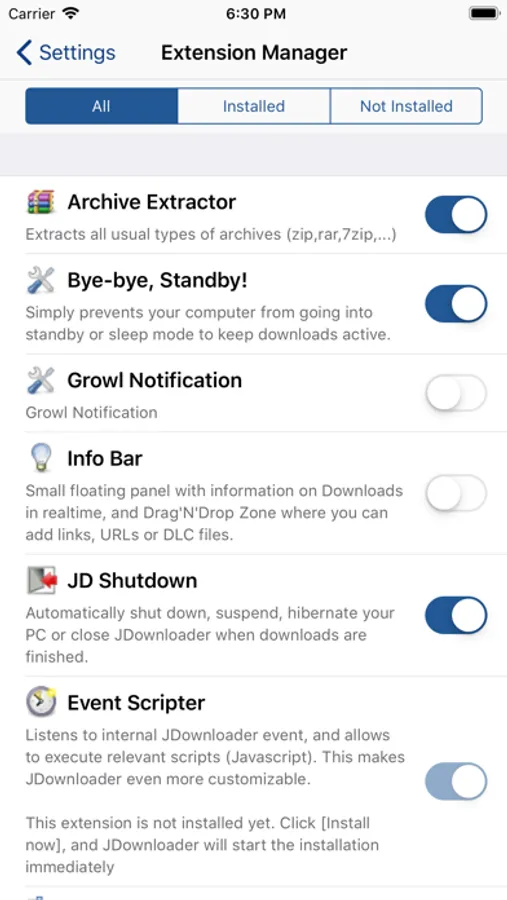 The app is completely free of charge and uses the official MyJDownloader API, which is also used by the MyJD web platform. On request, additional functions can be implemented. Please send a short email to the developer for that.