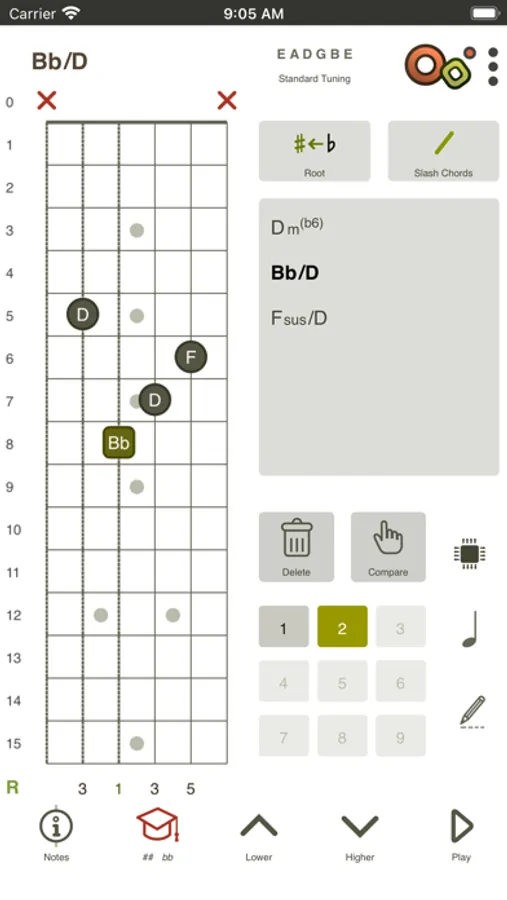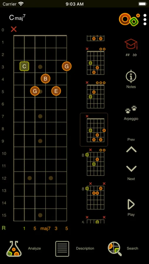 Instantly get syntactically right chord names for every inversion by entering a chord shape into the virtual fretboard.