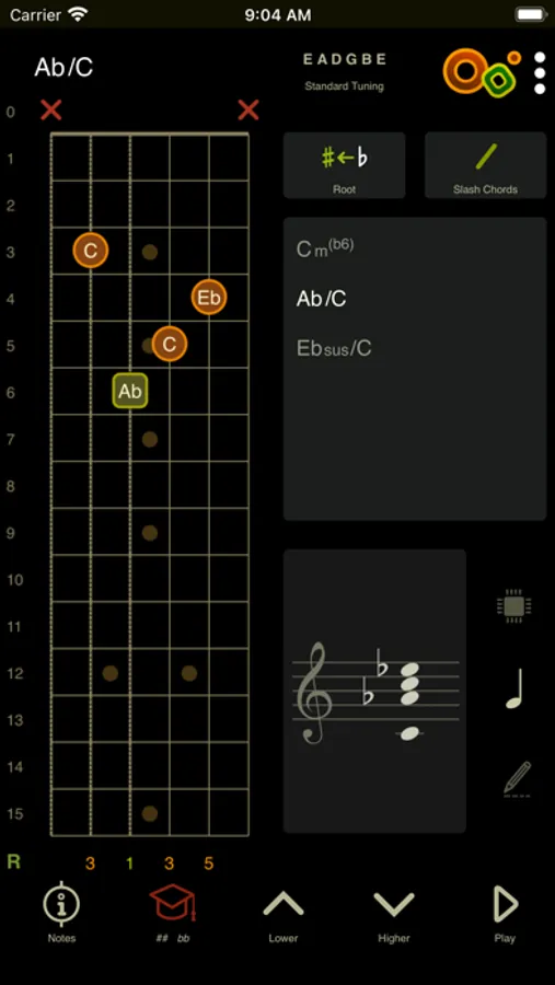 Advanced features like switching the root to its enharmonic equivalent, double accidentals, slash chord notation.