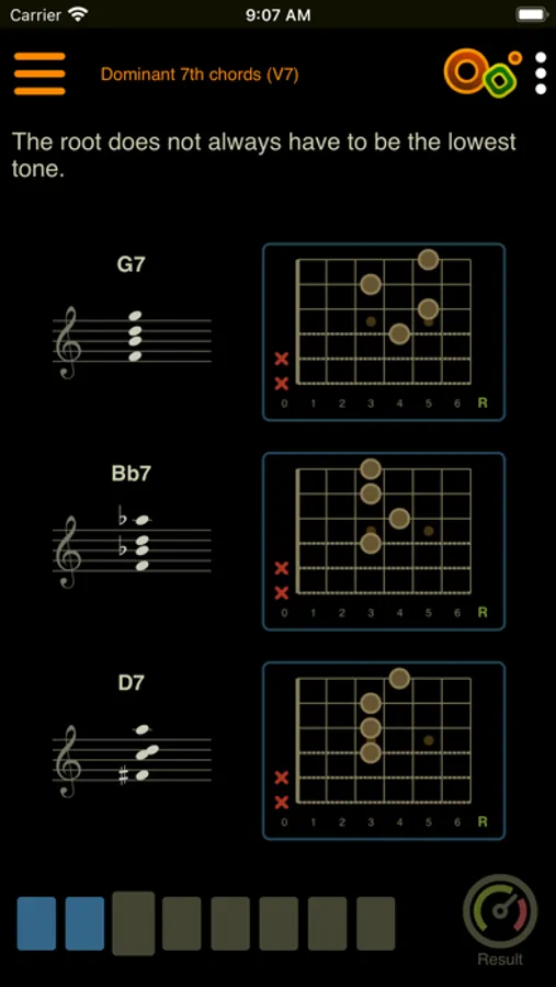 Improve and strengthen your guitar chord knowledge wherever you are. The various types of tasks will illuminate many aspects of guitar chords like chord construction or derivation, harmonic context, intervals and complementary intervals, differences between chord types or just chord voicings, tensions, modifications, etc. Last but not least the quizzes and are fun to do!