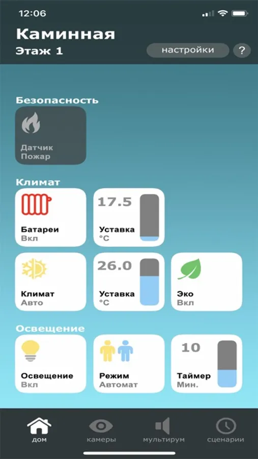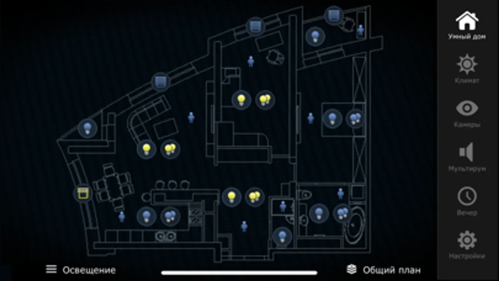 The application is designed to control engineering equipment in the house (lighting, climat, security, multiroom, etc.). A personal interface is developed for each customer. Demo interface can be downloaded by entering 'Demo'