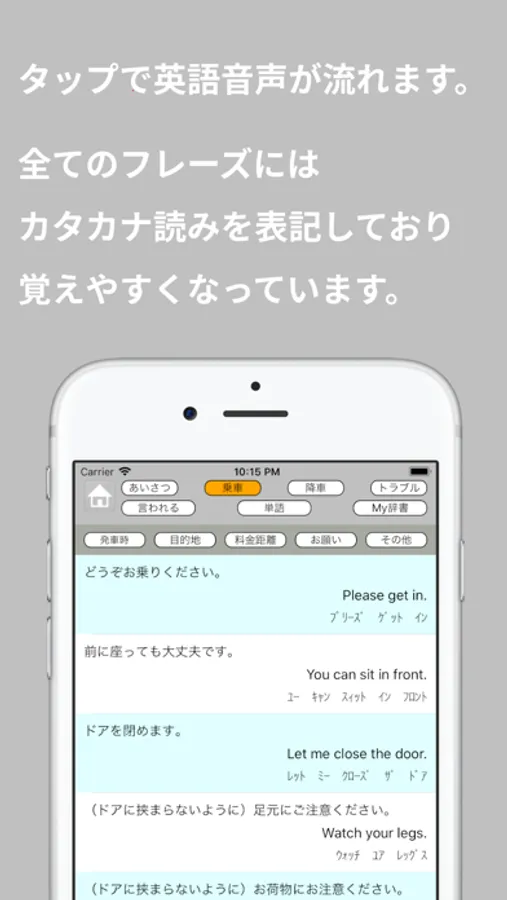 各フレーズはタップで英語音声が再生されます。また全ての英語フレーズにはカタカナ読みも表記しているので覚えやすくなっています。