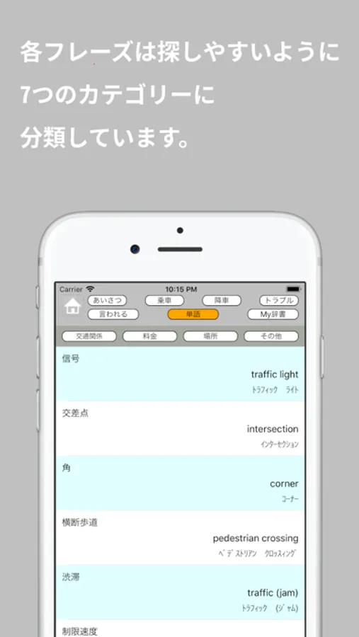 各英語フレーズは探しやすいように7つのカテゴリーに分類しています。