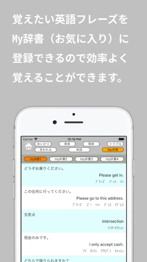 覚えたい英語フレーズはMy辞書(お気に入り)に登録できるので、効率よく覚えることができます。