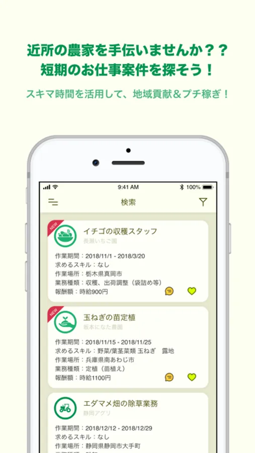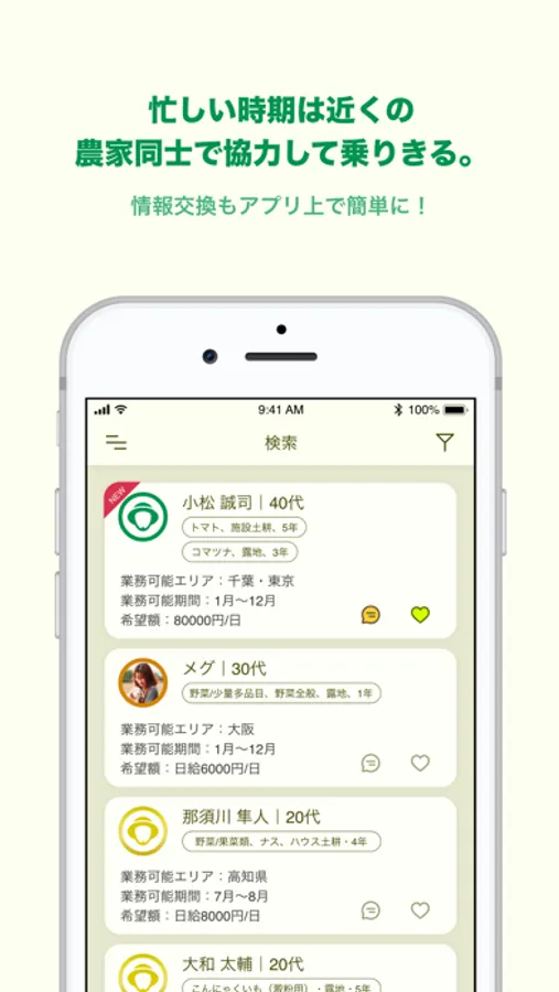 農mersでは、農作業をする人と農家がマッチした後は、チャットで会話できます。堅苦しい会話はいっさい不要!必要なことを素早くかんたんにやりとりしましょう。