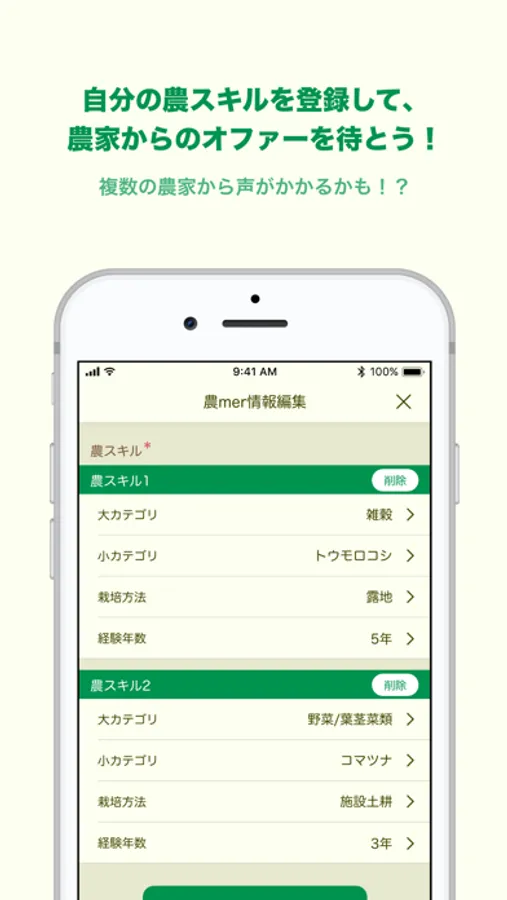 「農スキル」とは自分の農業の経験を簡単に表す機能です。農mersでは、この農スキルを使って農家や手伝いたい人に自分を知ってもらうことができます。