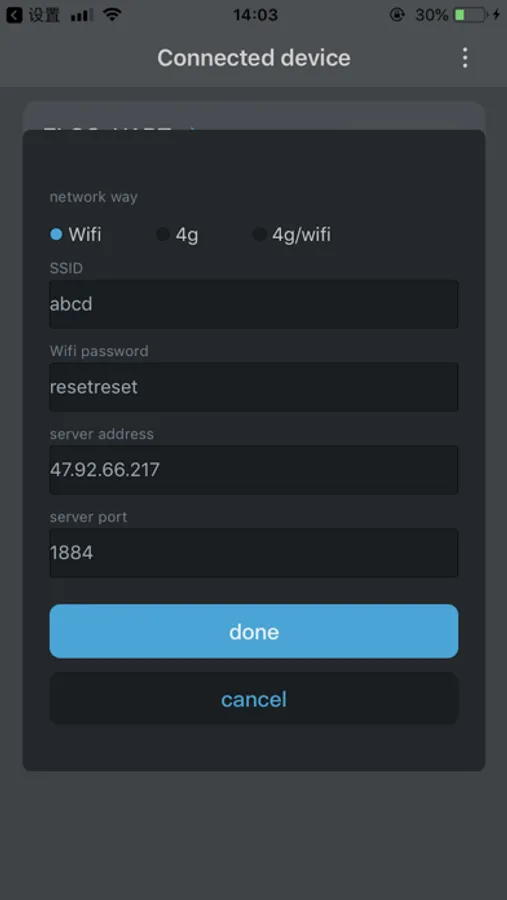 Based on the App, user can complete the network configuration of the SPMB series gateway, include selecting 4G mode or WiFi mode, WiFi AP mode or client mode, suitable for SPMB-16DIO, SPMB-04AIO, SPMB-04DIO, SPMB-16CIO series gateway.