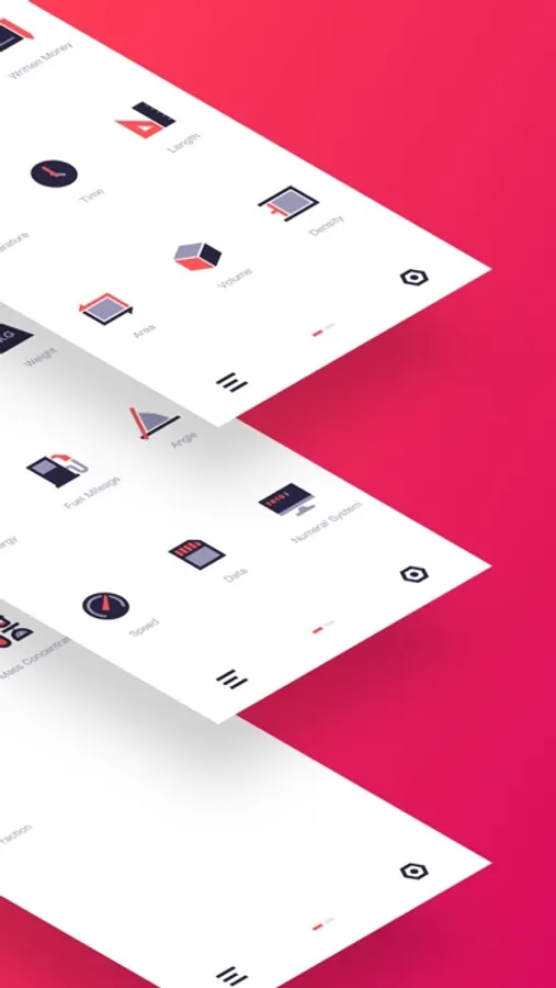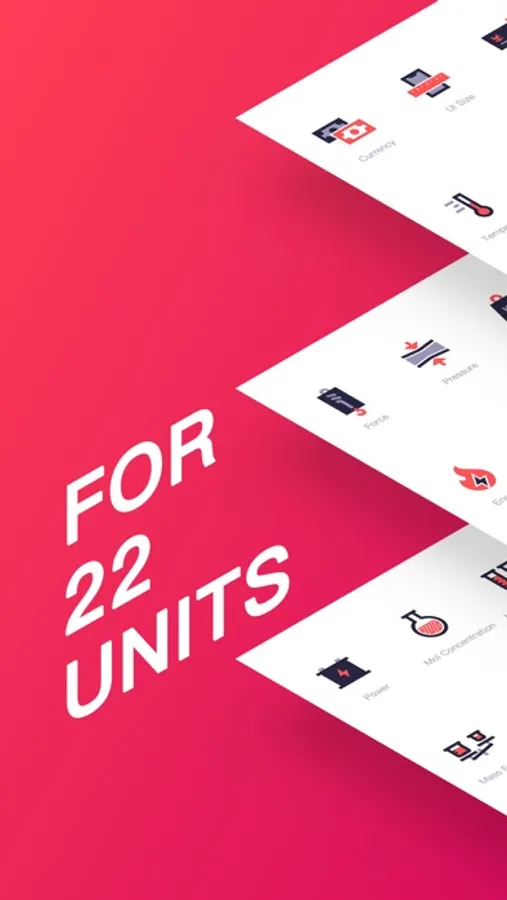 All units : Currency, Weight, Time, Length, Area, Volume, Speed, Force, Pressure, Temperature, Power, Data, Density, Angle, Numeral System, Energy, UI Size, Written Money, Fuel Mileage, Mol Concentration, Mass Concentration, Mass Fraction.