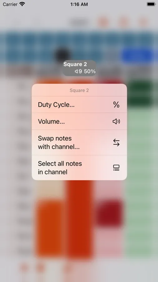 Each channel can play one note (or noise event) at a time. Square wave channels have 4 duty cycle parameters. and the noise channel has 32 adjustable noise presets. These parameters, as well as volume, are all adjustable at the channel or individual note level. Several example songs are included if you're just getting started and want to learn more.