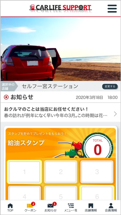 当社のアプリ「JA遠中カーライフサポート」ではアプリで簡単に洗車・コーティングなどのご予約や愛車のメンテナンス管理が可能の他、ご登録いただいた店舗でご利用いただけるお得なクーポンや各種メニューの割引情報を配信、20L以上の給油で1スタンプが貯まり決められたスタンプ数を貯めるとお得なクーポンと引き換えができる貯めて楽しいもらえて嬉しいお得なアプリです。