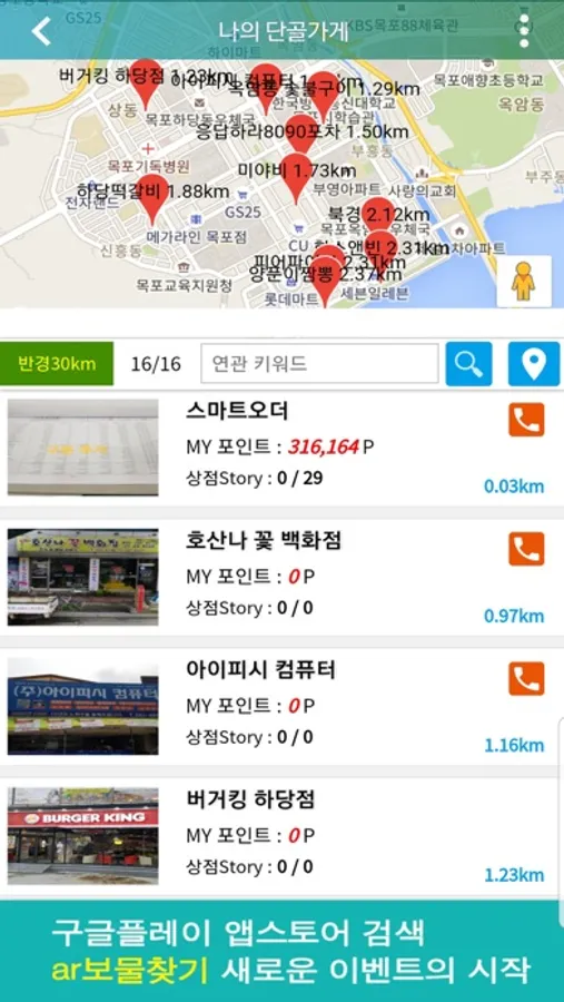 * 내 위치에서 가까운 순으로 상점 및 나의 단골가게 표시