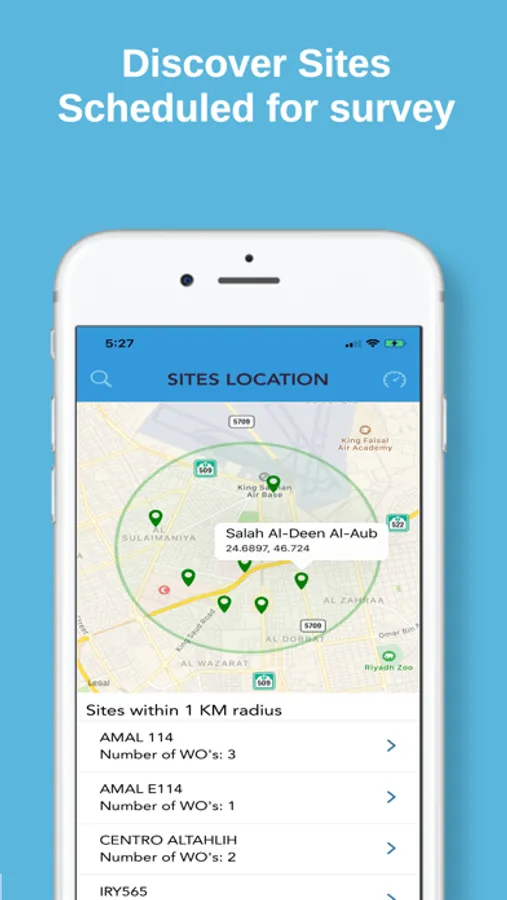 - select a location (defaults to current location) and view Sites with assigned Work Orders