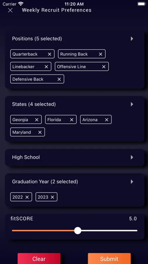 We help teams win by taking the guess work and the hard work out of recruiting. We’ll deliver 11 recruits directly to you on your phone each week. You can review the full recruit profiles including stats and scores and select the players that you want to analyze and track.