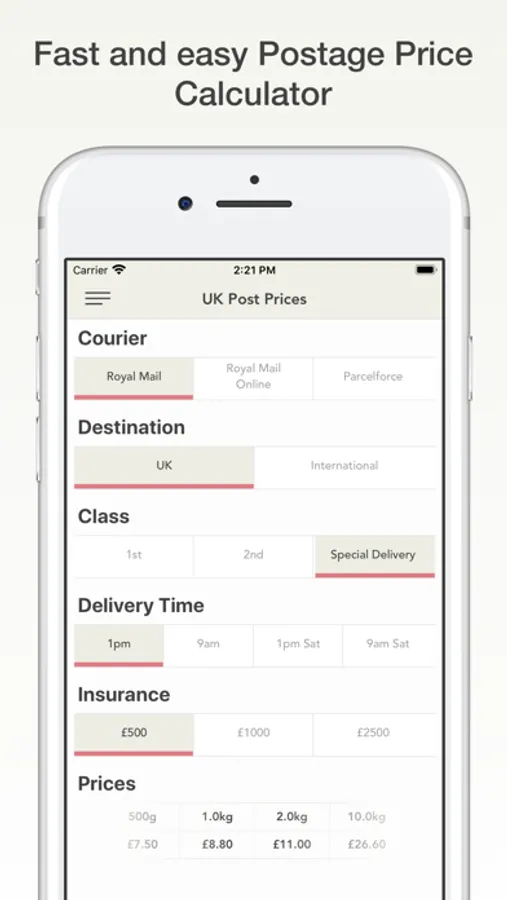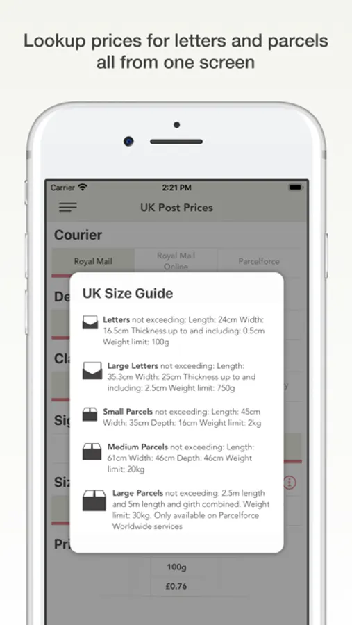Use UK Post Prices to lookup Royal Mail and Parcelforce personal customer delivery charges.