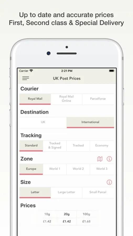 With a single screen its easy to find the correct postage price for your parcels and letters. No more downloading and deciphering pdf price sheets.