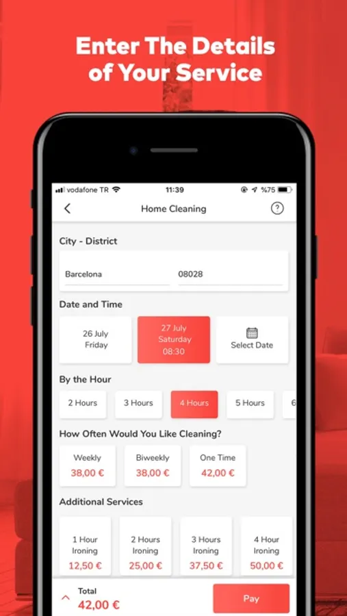 • After you choose the desired date and time for your service, enter your address info. for your cleaning service and number of hours needed for your ironing service.