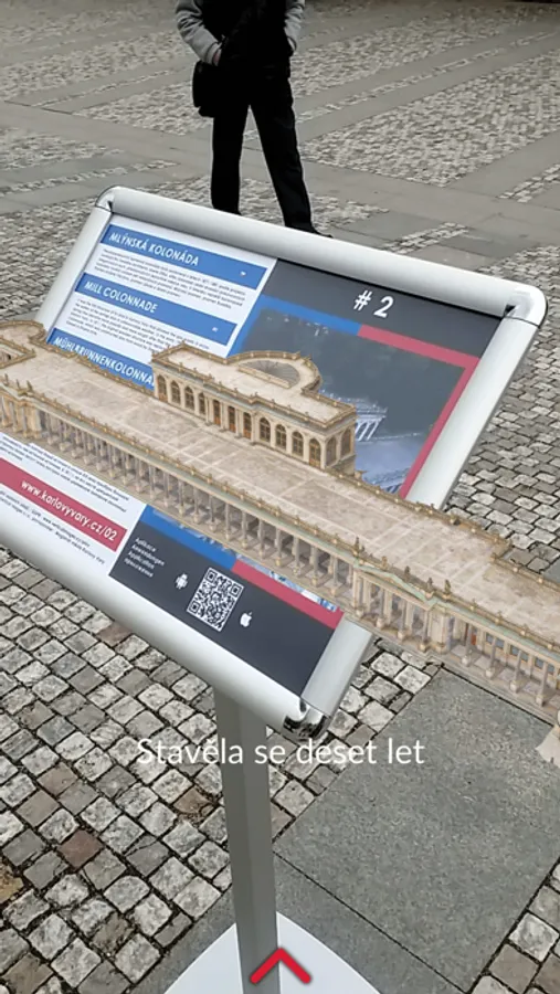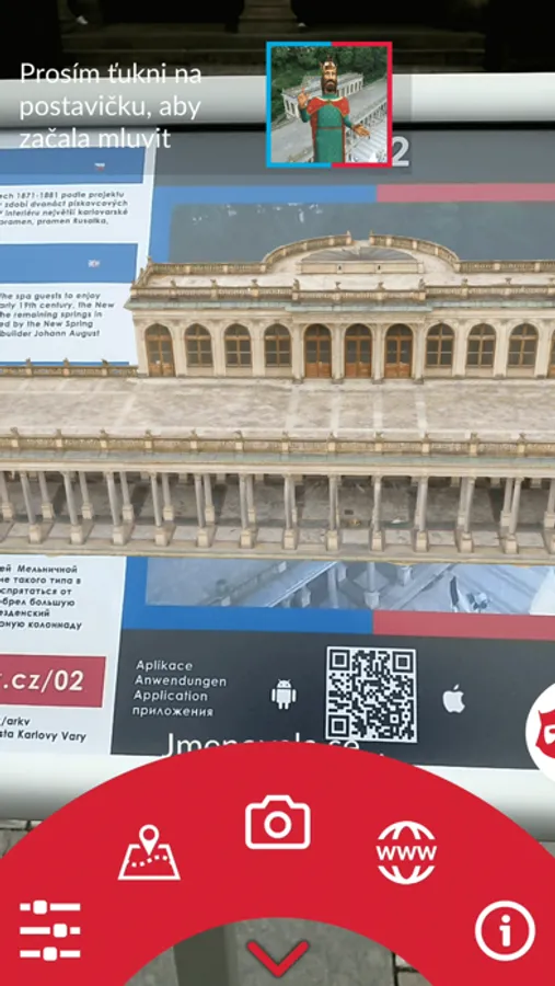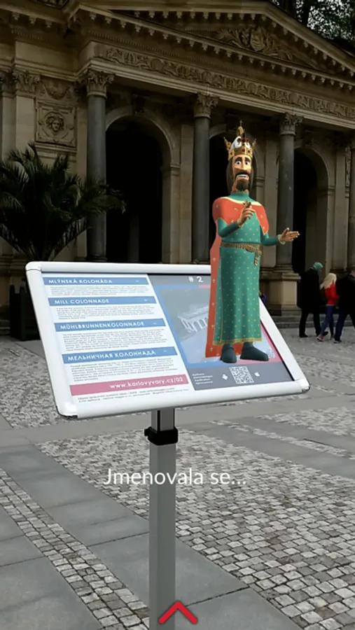 Ukázka digitálního průvodce Karlovými Vary s využitím rozšířené reality. Karel IV. vám řekne něco o Mlýnské Kolonádě a dá vám stručné informace o Infocentru.