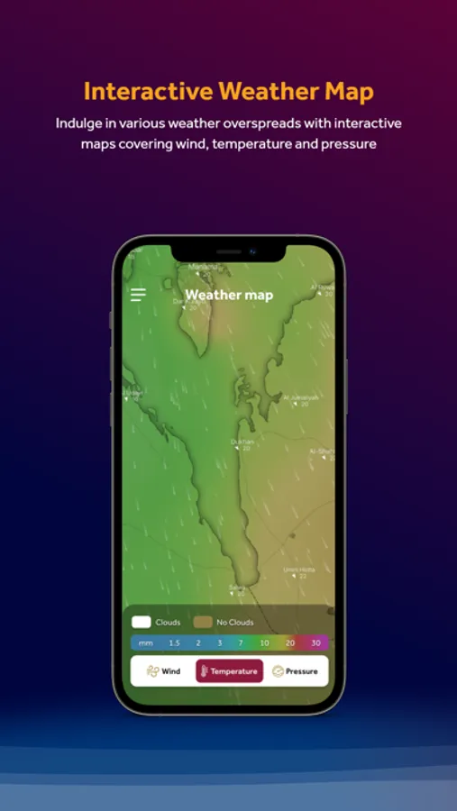 التطبيق يعرض بطريقة عرض مبتكرة الحالة الجوية بالاضافة الى اتجاه الرياح على الخرائط المختلفة.