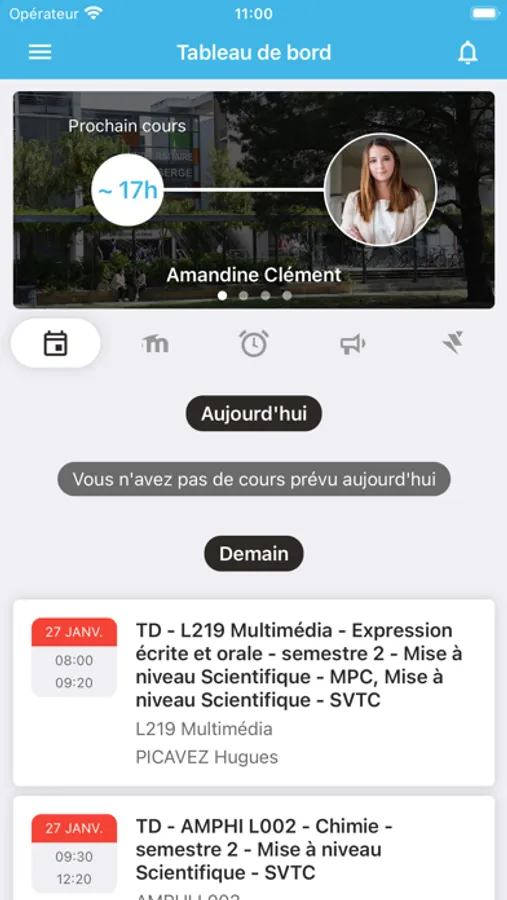 - Emploi du temps : consultez en temps réel votre planning de cours et recevez une notification en cas de changement dans les 48 heures précédant le cours (annulation, changement de salle …).