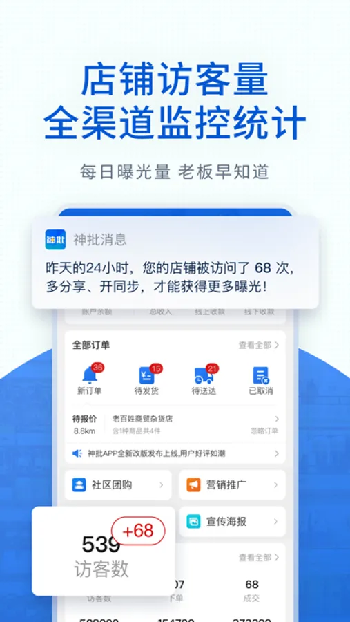 高效维系老客户!快速拓展新客源!不需要投入巨大成本,轻松拥有线上店铺。神批,让批发不再辛苦,让批发也能现代化。好生意,用神批!