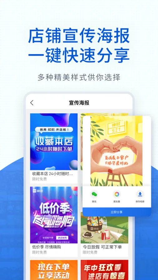 小程序店铺微信分享、商品微信分享、店铺拼团客户拓展、满减满赠满折、商品推荐、建立公众号商城等多种营销推广玩法!提升流量,吸纳新客户。