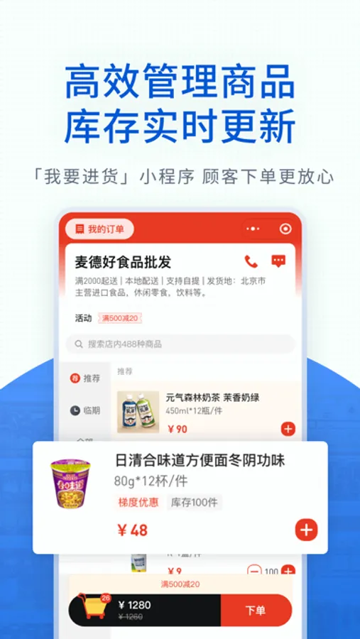 订单收益自动核算,热销商品,客户排名,营业状况智能统计。店铺经营情况全方位剖析。指导批发商经营策略调整。