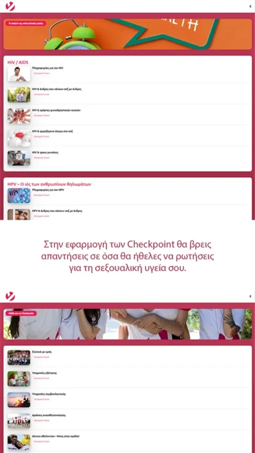Στην εφαρμογή των Checkpoint θα βρεις απαντήσεις σε όσα θα ήθελες να ρωτήσεις για τη σεξουαλική υγεία σου. Έχεις ανά πάσα στιγμή γρήγορη και εύκολη πρόσβαση σε χρηστικές πληροφορίες για την πρόληψη, τη θεραπεία και τα συμπτώματα των πιο σημαντικών σεξουαλικώς μεταδιδόμενων νοσημάτων. Μπορείς επίσης να ενημερωθείς για πολλά θέματα που σχετίζονται με το HIV/AIDS, καθώς και για τις υπηρεσίες δωρεάν εξέτασης που παρέχουμε στις δομές μας στην Αθήνα και στη Θεσσαλονίκη. Η ενημέρωσή σου είναι σημαντική! Ωστόσο, τα συμβουλευτικά κείμενα αυτής της εφαρμογής δεν υποκαθιστούν την ιατρική διάγνωση και παρακολούθηση.