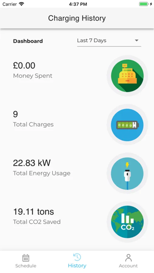 > History dashboard with recent charges and info including money spent, total kWh’s, the total number of charges & CO2 saved