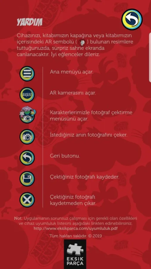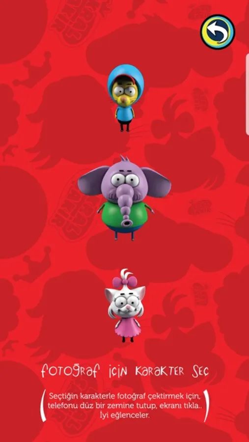 Uygulama açıldığında kitabın kapağına veya kitabın içindeki AR ikonu bulunan resimlere cihazınızı tuttuğunuzda canlanan karakterlerimizi izleyebilirsiniz.